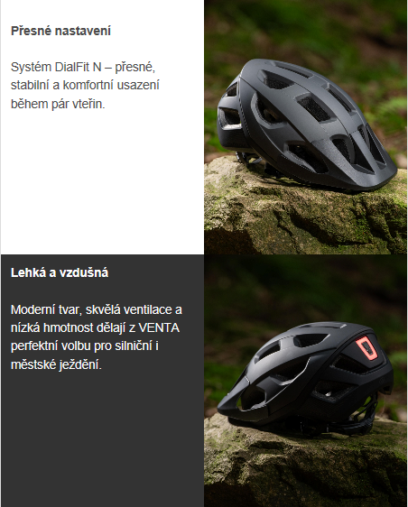 - Upínací systém DialFit N – NonSlip povrch kolečka a jemné odstupňování mechanismu umožňuje přesné a snadné nastavení obvodu vnitřní čelenky. Díky tomu má přilba optimální stabilitu a přizpůsobí se přesně tvaru hlavy.