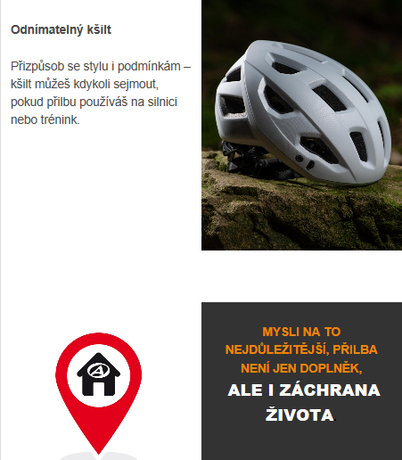 !!! Použití cyklistické přilby by mělo být samozřejmostí. Chrání vás před závažnými, často i fatálními zraněními hlavy, která mohou vzniknout i při malém pádu. Přilba funguje jako štít, který absorbuje energii a chrání váš mozek, a to je k nezaplacení !!!